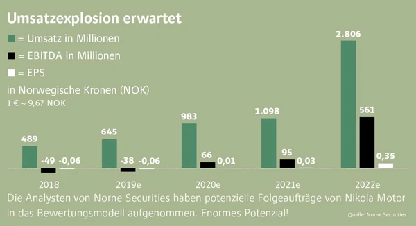 Darin enthalten: Die komplette Lieferung der 700 Stationen an das Start-up Nikola Motor. Den Gesamtgegenwert taxiert Norne Securities auf eine Milliarde Dollar. Allein dieser Auftrag steht für 7,40 Kronen des neuen Kursziels. Darüber hinaus könnte Nel langfristig in den Genuss weiterer Aufträge von Nikola Motor kommen. Schließlich planen die Amerikaner mit dem Truck „Nikola Tre“ Europa zu erobern.