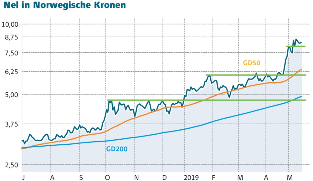 Die Norweger müssen aus den zahlreichen Projekten und Kooperationen endlich die Früchte ernten. Denn nach wie vor schreibt der Elektrolyse-Spezialist rote Zahlen. Trotzdem eilt die Nel-Aktie von Hoch zu Hoch. Anleger preisen also gewisse Ereignisse in naher Zukunft bereits ein. Die Story findet an der Börse weiter Anklang, die Aktie befindet sich in einem regelrechten Rausch. Aufgrund der hohen Volatilität kann es jedoch jederzeit zu Rücksetzern kommen.