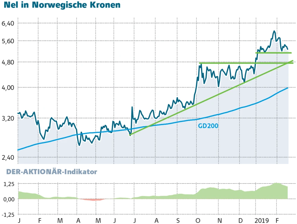 Im heutigen Handel verliert die Nel-Aktie 7,5 Prozent und rutscht deutlich unter die wichtige Marke von 5,00 Norwegischen Kronen. Von Unternehmensseite gibt es keine Neuigkeiten zu verzeichnen bis auf die Einladung zur Präsentation der Zahlen zum vierten Quartal 2018 am 27. Februar. Die wesentlichen Eckdaten für den Berichtszeitraum hat Nel bereits Ende Januar im Rahmen einer neuen Unternehmenspräsentation aufgezeigt.
