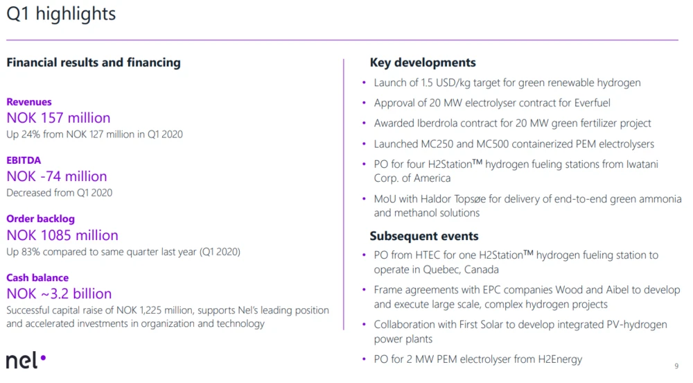Das EBITDA wird allerdings weiter von einmaligen und Anlaufkosten belastet. Bei dieser Kennziffer verbuchte Nel einen Fehlbetrag von 74,3 Millionen Kronen (7,4 Millionen Euro). Allerdings verfügt das Unternehmen über eine komfortable Cashposition, um das zu kompensieren. Zum Ende des ersten Quartals beliefen sich die liquiden Mittel auf 3,25 Milliarden Kronen (320 Millionen Euro).