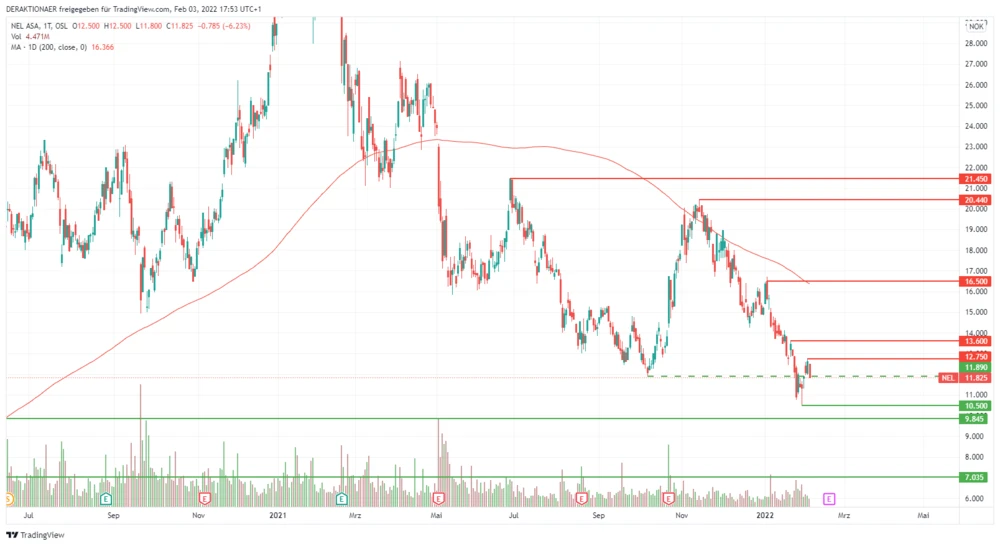 Die Aktie des norwegischen Wasserstoff-Spezialisten Nel steht nach einer kurzen Erholung nun wieder unter Druck. Die weiterhin angespannte Marktlage spitzte sich am Donnerstag zu, als auch die EZB mögliche Zinsanhebungen 2022 nicht mehr ausschließen will. Anleger müssen jetzt auf diese Marken achten.