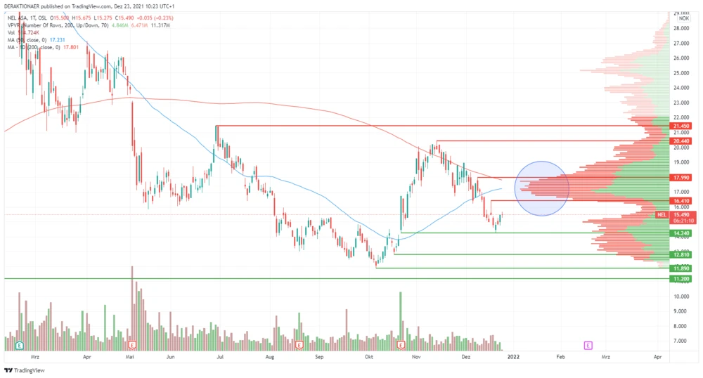Die Aktie von Nel befindet sich nach der starken Erholung im Oktober seit rund sechs Wochen in einer Konsolidierungsphase. Nachdem auch der GD200 und GD50 im Bereich der Marke von 17 bis 18 Norwegische Kronen (NOK) keinen nachhaltigen Halt geben konnten, fiel der Kurs bis auf ein Mehrwochentief bei 14,24 NOK. An diesem Level befindet sich auch ein technischer Support.