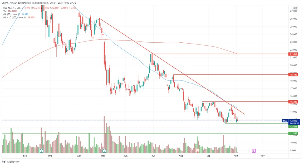 Der Wasserstoff-Sektor präsentiert sich in den vergangenen Tagen und auch am heutigen Montag durchwachsen. Insbesondere die Aktie von Nel kommt nicht aus dem Abwärtssog heraus. Der GD50 stellt momentan eine massive Hürde dar und auch vergangene Woche prallte der Kurs bei 15 Norwegische Kronen (NOK) nach unten ab.