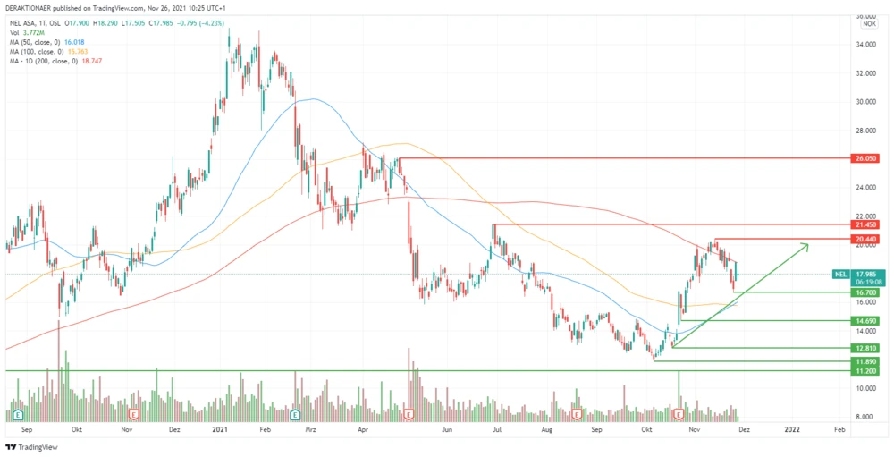 Die Aktie von Nel befindet sich nach der starken Erholung im Oktober seit rund zwei Wochen in einer Konsolidierungsphase. Dabei pendelt der Kurs um die wichtige 200-Tage-Line, die sich derzeit bei rund 19 Norwegische Kronen (NOK) befindet. Die aktuellen Gewinnmitnahmen sind nach der Rally zuvor nur logisch und daher aktuell kein Grund zur Sorge.
