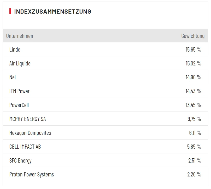 Neben Branchenschwergewichten wie den Industriegase-Herstellern Linde und Air Liquide zählen auch Wasserstoff-Überflieger wie Nel oder ITM Power nach Gewichtung zu den größten Werten im Index.