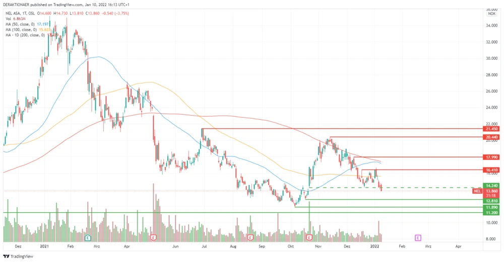 Technologie und kapitalintensive Wertpapiere, wie jene aus der Wasserstoff-Branche, stehen weiter unter Druck. Die Aktie von Nel rutscht am heutigen Montag nachhaltig unter die Unterstützung bei 14,24 Norwegische Kronen (NOK). Damit ist nun ein frisches Verkaufssignal ausgelöst worden und weiterer Abwärtsdruck entsteht. Der nächste Support steht bei 12,81 NOK bereit.