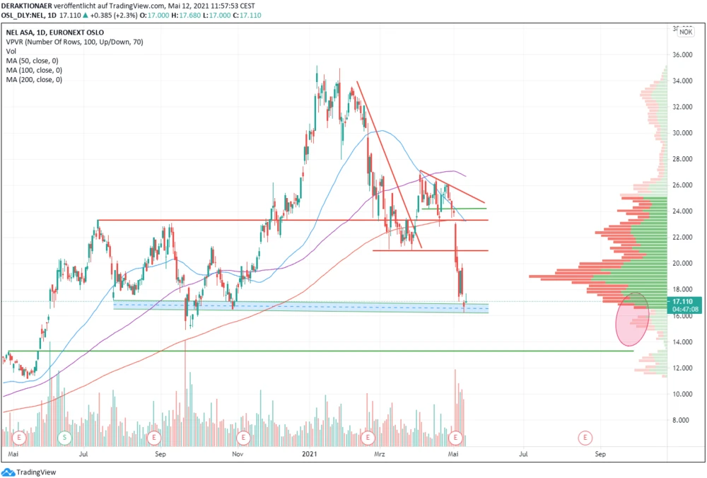 Nach Veröffentlichung der Quartalszahlen am 4. Mai löste der Kurs jedoch diese Formation bei 23,50 NOK nach unten auf und unterschritt noch am gleichen Tag die Unterstützungen an der 200-Tage-Linie bei 23,33 NOK und den Support bei 31 NOK. Inzwischen steht der Kurs an der Unterstützungszone, die zwischen 16,50 und 17,20 NOK verläuft, sowie an der unteren Begrenzung einer stark gehandelten Preiszone.