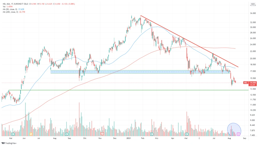 Letzte Woche hat sich das Chartbild der Nel-Aktie enorm eingetrübt. Das Papier fiel am 4. August unter die Unterstützungszone, die von den Zwischentiefs bei 16,50 und 17,20 Norwegische Kronen (NOK) ausging. Infolge dieses Verkaufssignals setzte der Titel bis zum Folgetag in der Spitze um 16 Prozent zurück. Dabei unterschritt er die 15-NOK-Marke und verstärkte damit das Verkaufssignal.