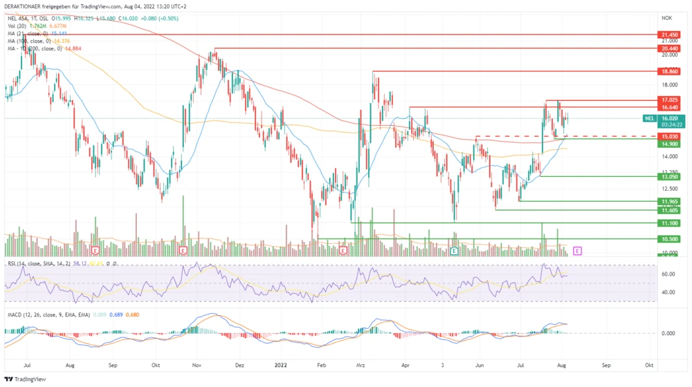 Der Newsflow bei Nel und anderen Green-Tech-Titel hat in den letzten Wochen für eine Reihe positiver Überraschungen gesorgt (DER AKTIONÄR berichtete – siehe Artikelliste am Ende). Die Nel-Aktie legte seit Mitte Juli bereits 23,4 Prozent zu. Auch der wichtige GD200 bei 14,88 Norwegische Kronen (NOK) haben die Bullen hinter sich gelassen. Der Indikator fungiert nun als starke Unterstützung für die weitere Erholung.