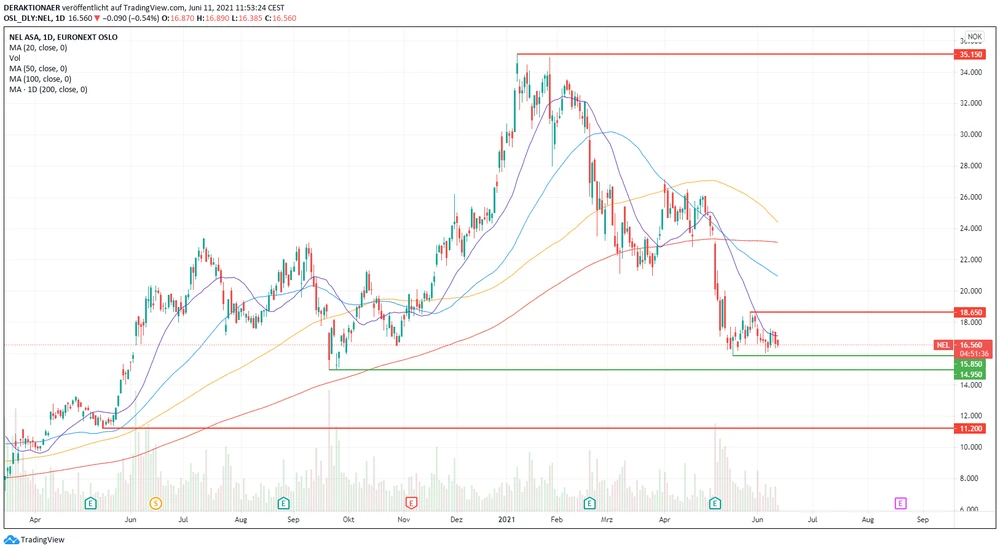 Die Aktie befindet sich seit Mitte Mai in einer Sackgasse und pendelt ziellos zwischen der Unterstützung bei 15,85 NOK und dem Widerstand bei 18,65 NOK hin und her. Der Kurs scheint sich zu stabilisieren, als zusätzliche technische Unterstützung befindet sich bei 14,95 NOK eine markante Preismarke aus 2020. Wichtig ist, dass dieses Level nicht nachhaltig unterschritten wird, sonst drohen weitere Kursverluste. Der übergeordnete technische Trend ist aktuell noch short und es kann erst Entwarnung gegeben werden, wenn die Aktie den Sprung über 18,65 NOK schafft.