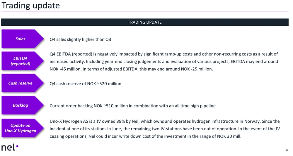 Nel hat zudem eine neue Unternehmenspräsentation inklusive Trading Update veröffentlicht. So sollen die Erlöse im vierten Quartal 2019 über dem vorangegangenen Quartal liegen. Das EBITDA bewegt sich weiter im roten Bereich. Allerdings kann Nel mit einem hohen Auftragsbestand punkten.