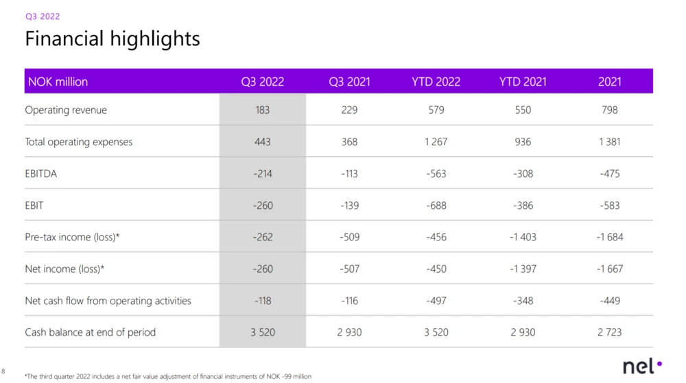 Im Berichtszeitraum verzeichnete Nel einen Rückgang beim Umsatz von 29 auf 183 Millionen Norwegische Kronen (17,6 Millionen Euro). Analysten erwarteten jedoch ein Umsatzplus auf gut 236 Millionen Kronen (22,7 Millionen Euro). Der EBITDA-Fehlbetrag in Höhe von 214 Millionen Kronen lag im Rahmen der Erwartungen (Schätzung: Fehlbetrag von 213 Millionen Kronen).