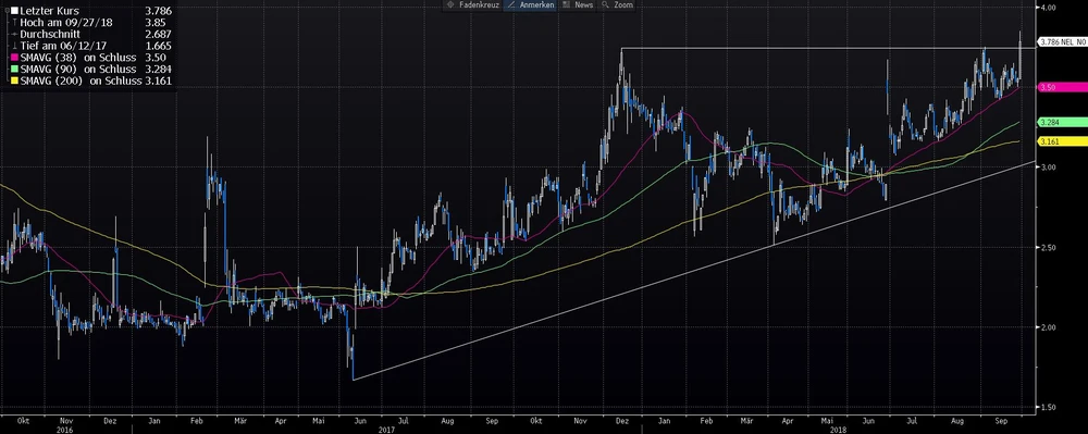 Die Geduld zahlt sich allmählich aus: Im gestrigen Handel ging die Aktie mit 3,79 Norwegische Kronen aus dem Handel und markierte im Tagesverlauf ein neues Mehrjahreshoch bei 3,85 Kronen. Damit konnte die hartnäckige Widerstandszone im Bereich von 3,75 Kronen überwunden werden. Investierte Anleger geben kein Stück aus der Hand, bei Schwäche können mutige Anleger nach wie vor zugreifen.