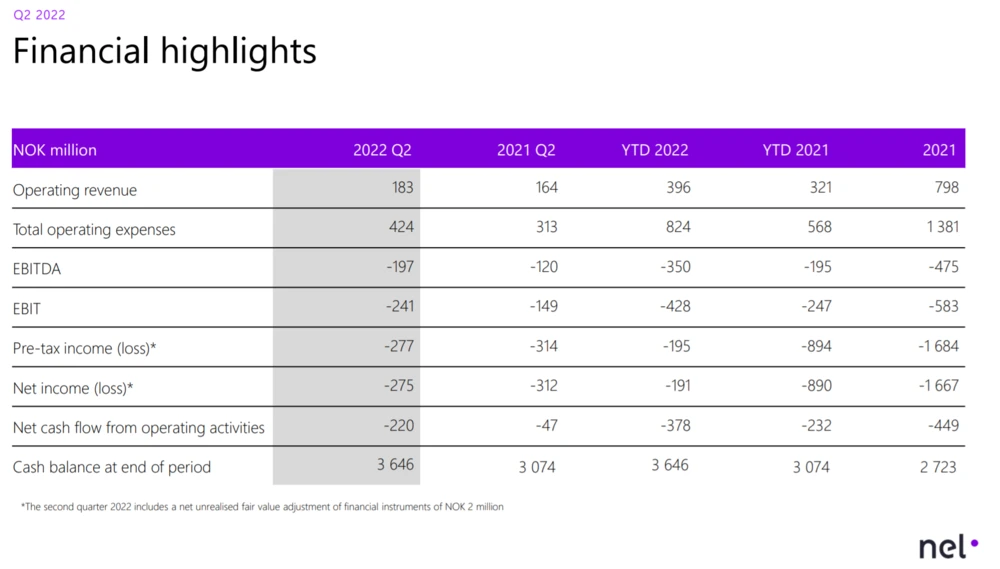 Weniger erfreulich sind die hohen Verluste, die Nel weiterhin schreibt. Der Verlust beim EBITDA in Höhe von 197 Millionen Kronen (20,1 Millionen Euro) übersteigt den gesamten Umsatz im Quartal und auch den von Analysten in Aussicht gestellten EBITDA-Fehlbetrag von 143,1 Millionen Kronen (14,4 Euro).