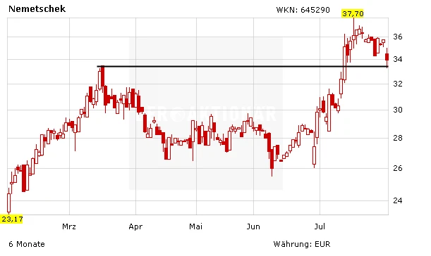 Trotz des Rücksetzers notiert die Nemetschek-Aktie nach wie vor oberhalb des Widerstands bei gut 33 Euro. Die vorsichtigen Aussagen der Vorstandschaft sind allerdings ein Stimmungsdämpfer. Neueinsteiger warten deshalb vorerst ab. Investierte Anleger bleiben an Bord.