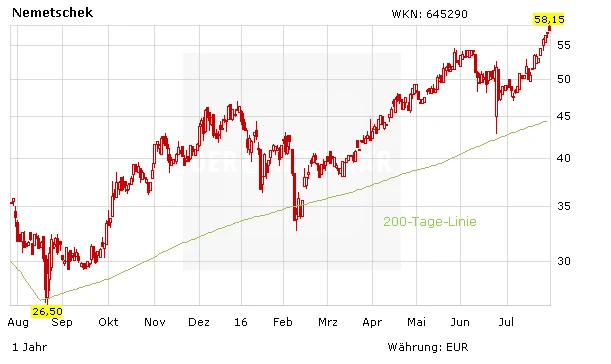Die Aktien von Nemetschek liegen nach Zahlen deutlich im Minus. Nach einem Plus von über 60 Prozent in einem Jahr und neuen Allzeithochs ist es nicht ungewöhnlich, dass das Papier neue Kraft sammelt. Zudem scheint der Markt die starke Geschäftsentwicklung bereits eingepreist zu haben. Mit einem 2016er KGV von 43 ist Nemetschek alles andere als günstig bewertet. Der AKTIONÄR hatte Nemetschek vor längerem zum Kauf empfohlen. Durch die Turbulenzen nach dem Brexit wurde der Wert aber ausgestoppt. Ein Neueinstieg drängt sich derzeit nicht auf