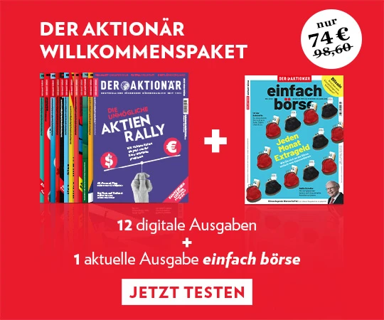 Das Willkommenspaket von DER AKTIONÄR macht Ihnen den Einstieg leicht: Mit 12 digitalen Ausgaben zum Vorteilspreis von 74 statt 98,60 Euro sparen Sie über 20 Prozent. Zusätzlich erhalten Sie eine aktuelle Ausgabe einfach börse mit Tipps rund um die moderne Geldanlage.