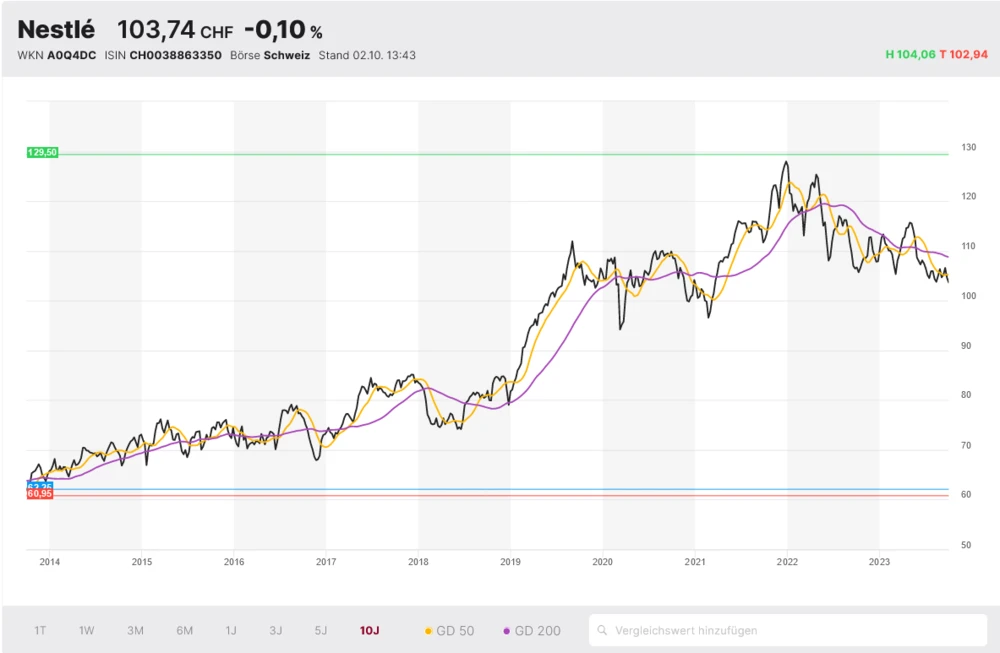 Der Schritt hin zu gesünderen und somit fett- und zuckerreduzierten Lebensmitteln ist aus Sicht des Konzerns durchaus nachvollziehbar. Nestlé hat in diesem Bereich Nachholbedarf, da lediglich etwas mehr als 30 Prozent in Produkten mit dem Wert 3,5 umgesetzt werden. Langfristig dürfte der Konzern von dieser Strategie profitieren. Aktuell befindet sich die Aktie in einem Abwärtstrend, Kurse unter 100 CHF können zarte Einstiegsgelegenheiten sein.