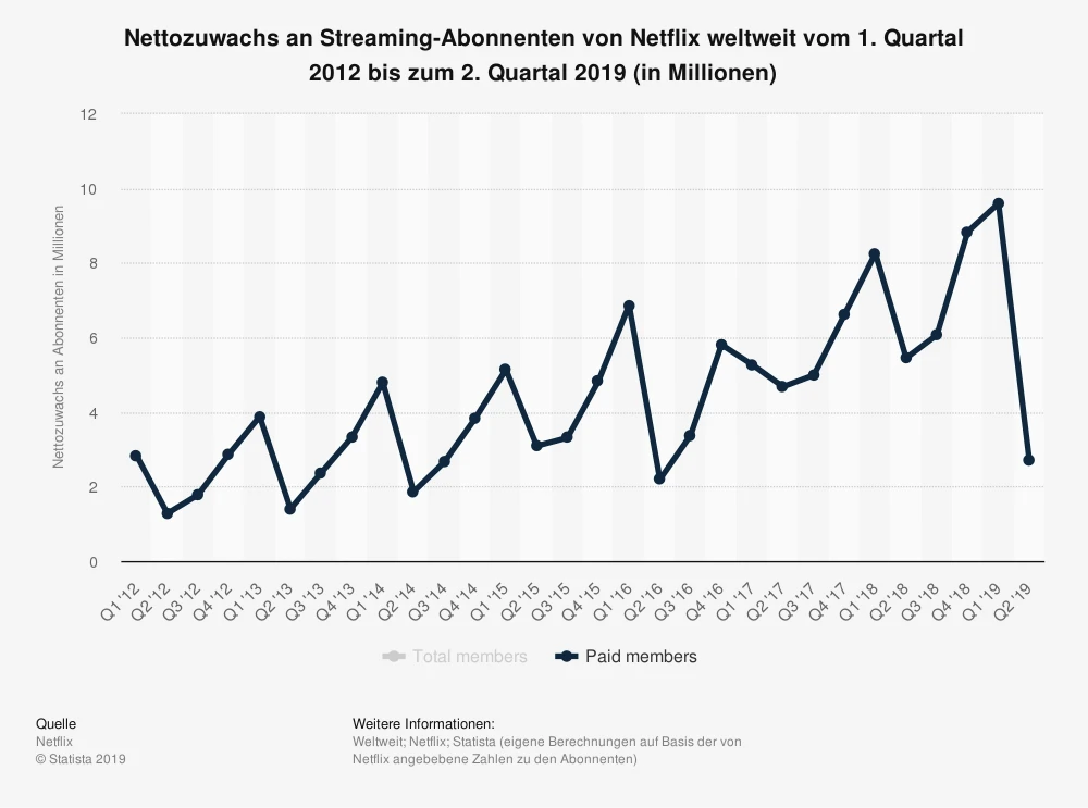 Die riskante Strategie hat in den vergangenen Jahren für einen beachtlichen Nutzerzuwachs gesorgt. Doch spätestens seit den Q2-Zahlen bekommt die Wachstumsstory Kratzer. Dabei nimmt der Konkurrenzkampf mit dem Start der günstigeren Konkurrenzprodukte Apple TV Plus (1. November) und Disney Plus (12. November) im Schlussquartal erst so richtig Fahrt auf. Im neuen Jahr folgen dann auch noch Peacock von NBC und WarnerMedia von AT&T.