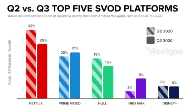 Mit Blick auf Statistiken der Empfehlungsplattform Reelgood (2 Mio. Nutzer) schreibt Martin: "Laut Reelgood stammten im Q3 nur 25 Prozent der gestarteten Streams von Netflix, ein signifikanter Rückgang gegenüber Q2 (32 Prozent)."