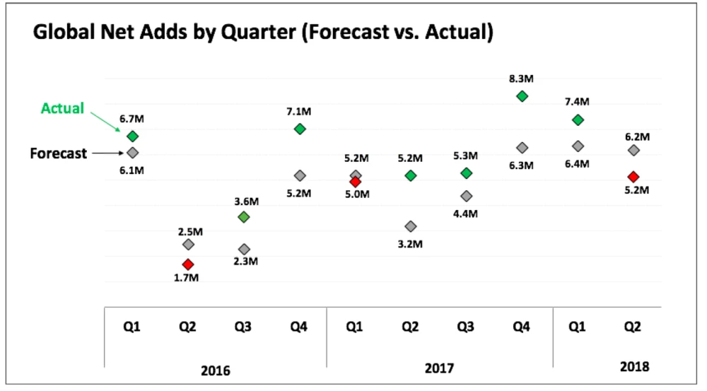 Auch wenn die Enttäuschung im zweiten Quartal das Bild etwas getrübt hat: Insgesamt ist Bilanz von Netflix klar positiv. In den vergangenen zehn Quartalen wurde die Neukundenprognose sieben Mal übertroffen, davon fünfmal um mehr als 20 Prozent. Zweimal in Folge wurden die eigenen Zielvorgaben in diesem Zeitraum noch nie verfehlt. Die Kursreaktion der Netflix-Aktie auf die Quartalszahlen war in 60 Prozent der Fälle positiv – im Schnitt ging es für die Aktie anschließen jeweils um fast zehn Prozent nach oben.