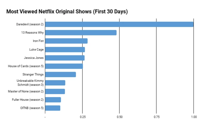 Mit den Marvel-Serien „Daredevil“, „Jessica Jones“, „Luke Cage“ und „Iron Fist“ hat Netflix zuletzt einen Hit nach dem anderen gelandet. Wie das Branchenmagazin Variety unter Berufung auf eine Untersuchung der Analysefirma Jumpshot meldet, landeten alle vier Serien unter den Top 5 der am meisten angesehenen Netflix Originals innerhalb der ersten 30 Tage nach der Premiere – zumindest in der jüngeren Vergangenheit. Nur die Drama-Serie „13 Reasons Why“ (in Deutschland: „Tote Mädchen lügen nicht“) konnte sich in dem Jumpshot-Index dazwischen schieben.