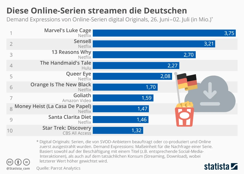 Mit drei Eigenproduktionen steht Netflix unangefochten an den ersten drei Plätzen der beliebtesten Online-Serien in Deutschland. Allein mit „Marvel’s Luke Cage“, „Sense8“ sowie der Dramaserie „13 Reasons Why“ erreicht der US-Techriese eine Demand Expression von mehr als neun Millionen. In der Maßeinheit wird neben der medialen Auseinandersetzung mit dem Titel, vor allem der tatsächliche Konsum, sei es Streaming oder Download, berücksichtigt.
