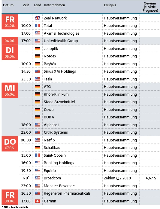Nach der Berichtssaison stehen Anfang Juni vor allem die Hauptversammlungen im Blickpunkt. Während die DAX-Konzerne ihre Aktionäre bereits zum jährlichen Treffen eingeladen haben, stehen sowohl in der zweiten Reihe in Deutschland als auch in den USA viele Termine noch an. Kaum Kritik dürfte es auf der Hauptversammlung des Streaming-Anbieters Netflix geben.