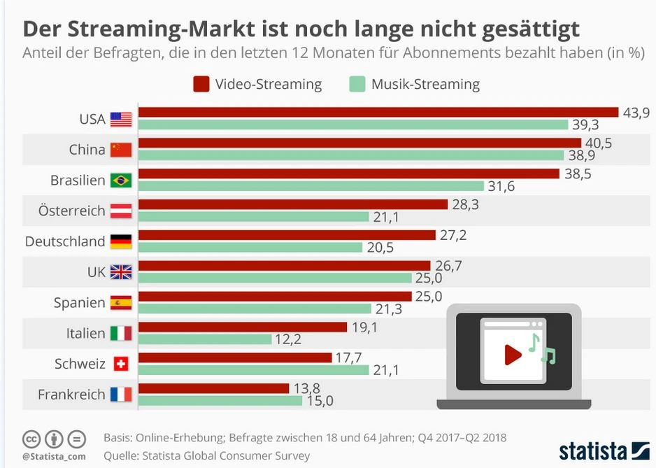 Die gute Nachricht: Potenzial ist im Streaming-Markt noch reichlich vorhanden. In den USA, dem stärksten Streaming-Markt, liegt der Anteil der streamenden Haushalte lediglich bei 43 Prozent. In europäischen Ländern liegt sie oft unter 30 Prozent.