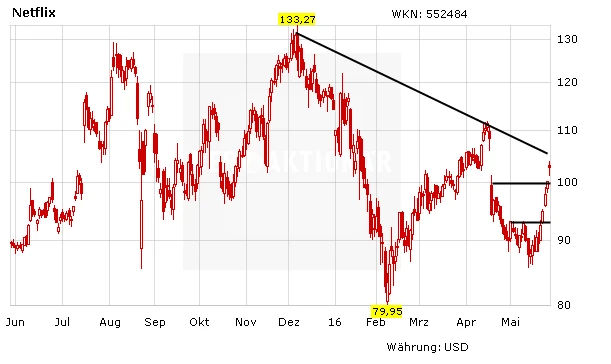 Die Gerüchte heizten der Aktie ordentlich ein. Seit Wochenstart konnte Netflix gut acht Prozent auf 102,81 Dollar zulegen. Der Abwärtstrend konnte zwar noch nicht gebrochen werden, die ersten Hürden wurden aber bereits genommen. Sowohl der Widerstand bei 94 Dollar als auch das Ziel von 100 Dollar wurden überschritten. Nun ist der Weg bis zum Hoch vom April bei 111, 85 Dollar frei. Spekulativ orientierte Anleger wagen einen Trade.