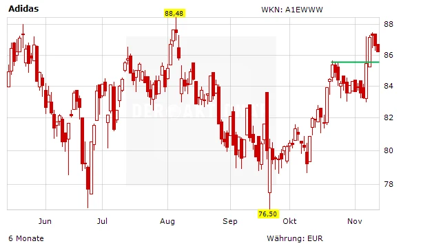 Adidas dürfte von der WM in Brasilien im besonderen Ausmaß profitieren, schließlich behauptet der Konzern nach wie vor die führende Stellung im Fußball-Segment knapp vor Nike. Die Aktie konnte ausgehend vom September-Tief 77,70 Euro zunächst bis auf etwa 85,30 Euro zulegen. Nach einer kurzen Konsolidierung knackte das Papier dieses Hoch und nimmt nun den Widerstand bei 88,35 Euro ins Visier. Die Chancen stehen gut, dass diese Hürde im dritten Anlauf genommen wird.