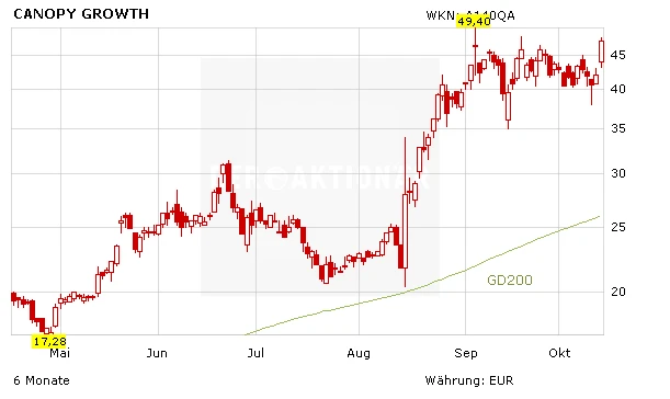Was für ein Wochenauftakt für die Cannabis-Aktien: Cronos schießt am Montag in Toronto 18,5 Prozent nach oben, Canopy Growth gewinnt 13,6 Prozent, Tilray 11,7 Prozent und Aurora Cannabis zehn Prozent. Beflügelt wurden die Werte sicherlich von der allgemein guten Stimmung in dieser Woche. Das Gesetz zur Legalisierung von Cannabis in Kanada tritt in dieser Woche am Mittwoch in Kraft, in Großbritannien wurden entschieden, dass medizinisches Cannabis ab dem 1. November von Ärzten verschrieben werden darf.