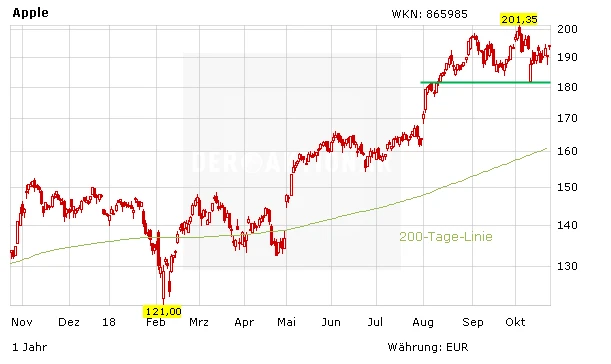 Der schwache Gesamtmarkt und die Angst vor einem eskalierenden Handelsstreit zwischen den USA und China haben auch die Apple-Aktie zuletzt belastet, doch die übergeordneten Trends sind allesamt intakt. Hinzu kommt die Fantasie im TV-Geschäft. Der Kurs notiert aktuell keine fünf Prozent unter dem bisherigen Allzeithoch von 233,47 Dollar. Kurzfristig könnten die Keynote und die Q3-Zahlen in der kommenden Woche für frische Impulse und eine Fortsetzung der Aufwärtsbewegung sorgen.