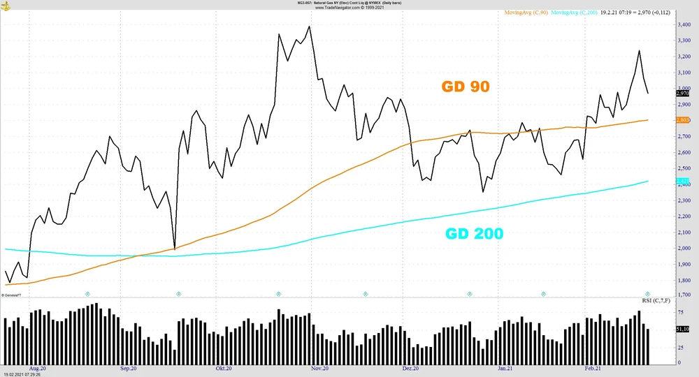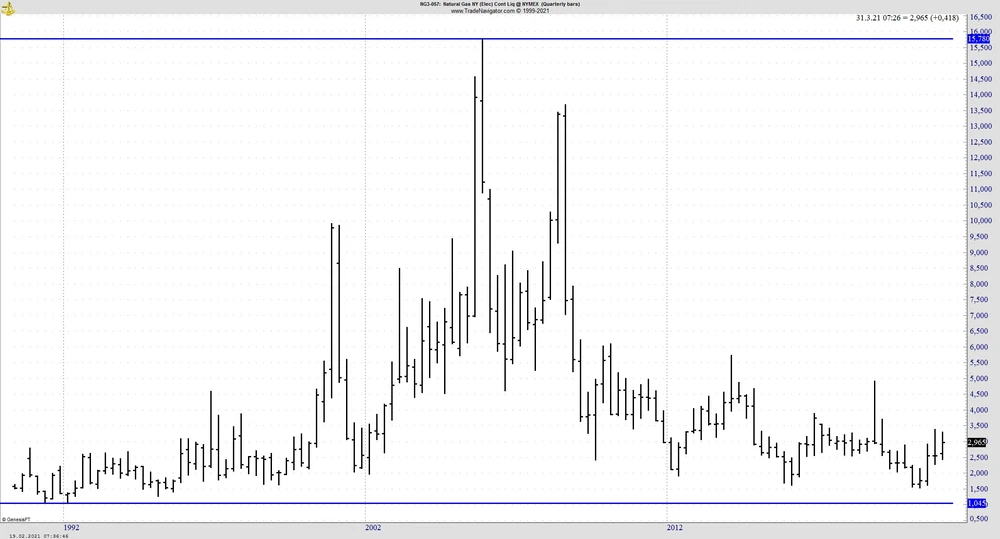 Der Natural Gas Future ist sicherlich einer der volatilsten Futures aus dem Energie Sektor. Im Februar 1992 handelte der Future im Tief bei 1,045 US-Dollar. Die nächsten Jahre stieg der Future unter sehr großen Schwankungen immer weiter und erreichte im Dezember 2005 bei 15,78 US-Dollar sein All-Time-High. Zwischenzeitlich kam es immer wieder zu spektakulären Rallyes und verheerenden Kurseinbrüchen innerhalb kürzester Zeit. Im Dezember 2000 verlor der Natural Gas Future von 9,925 US-Dollar knapp 80 Prozent, um dann wieder auf 8,50 US-Dollar zu steigen. Seit seinem letzten markanten Hoch bei 13,694 US-Dollar im Juli 2007 befindet sich Natural Gas in einem intakten Abwärtstrend.
