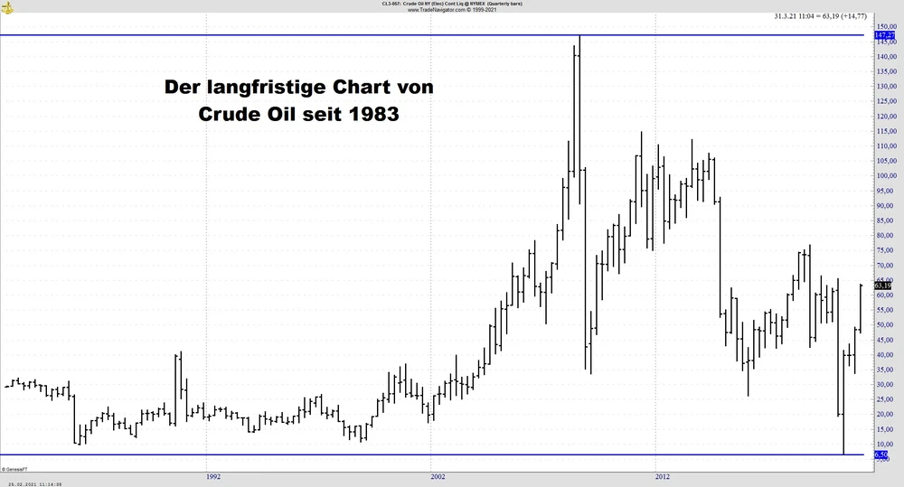 Nach der Befreiung Kuwaits 1991 handelte Crude Oil die nächsten 20 Jahre in einer Seitwärtsrange, um dann mit Beginn des dritten Golfkrieges 2003 wieder über die 40 Dollar zu schießen. Im Zuge der weltweiten Rohstoffhausse erreichte Crude Oil im September 2009 sein All Zeit Hoch bei 147,27 Dollar, das sogenannte „Peak-Oil“. Danach verlor Crude Oil innerhalb von nur sechs Monaten während der Finanzkrise mehr als 75 Prozent und notierte wieder für kurze Zeit unter 40 Dollar.