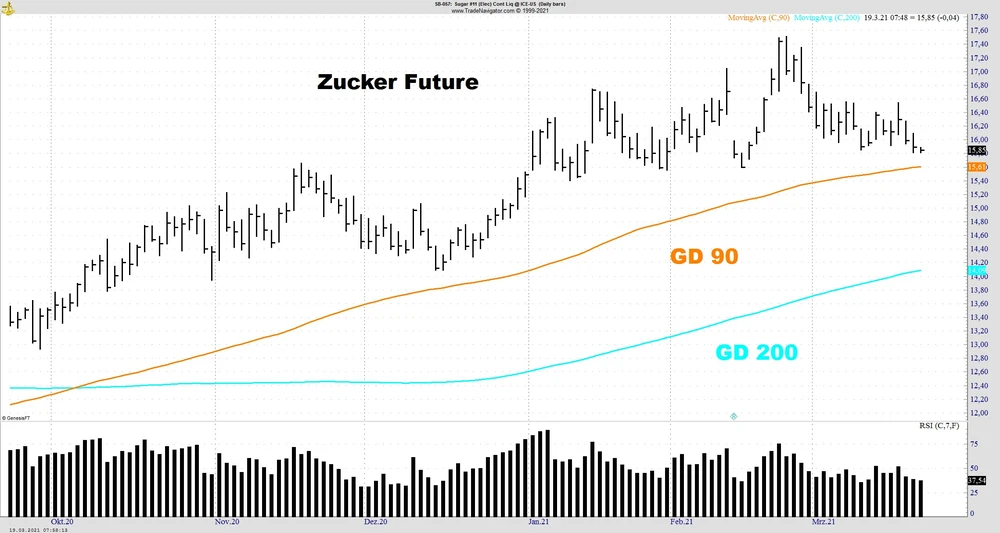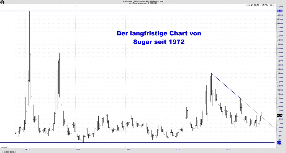 Der Zucker explodierte Anfang der 70er Jahre in der Rohstoffhausse von 5,41 US-Cent im Sommer 1972 und verzwölffachte sich innerhalb von nur zwei Jahren auf 66 US-Cent Ende 1974. Danach folgte der jähe Absturz bis auf 6,05 US-Cents im Juli 1978 um dann wiederum in zwei Jahren um 650 Prozent auf 45,75 US-Cents zu steigen. Im Sommer 1985 markierte der Sugar-Future sein bisheriges Rekordhoch bei 2,74 US-Cents. Die weltweiten Rohstoffanstiege bis ins Jahr 2011 bescherten dem Zucker noch einmal Kurse über 35 US-Cents, seitdem befand sich der Future in einem Abwärtstrend aus dem er 2020 ausbrechen konnte. Langfristig betrachtet ist Zucker somit sicherlich einer der volatilsten Rohstoffe.