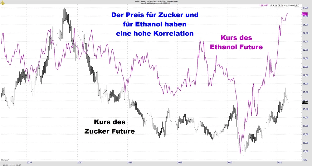 Brasilianische Zuckerrohrproduzenten können das von ihnen geerntete Zuckerrohr zerkleinern, um Zucker oder Ethanol zu produzieren. Da Ethanol auch mit Benzin als Transporttreibstoff konkurriert, führt ein Rückgang des Benzinpreises (aufgrund niedrigerer Ölpreise) tendenziell zu niedrigeren Ethanolpreisen und damit zu einer geringeren Nachfrage nach Zucker zur Herstellung von Ethanol.