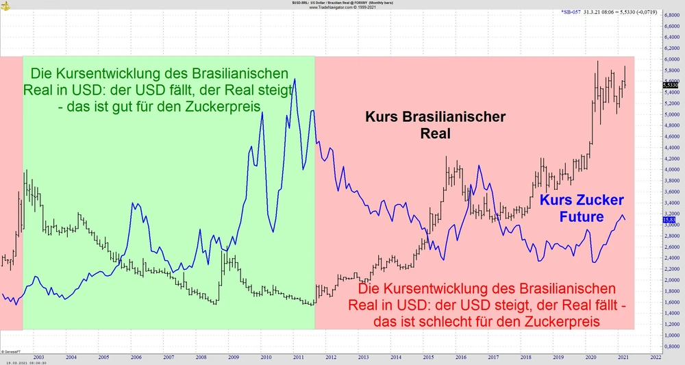 Der Wert des Brasilianischen Real ist einer der wichtigsten Einflussfaktoren für den Zuckerpreis. Ein Rückgang des Wertes der brasilianischen Währung erhöht den Anreiz für brasilianische Landwirte, die Produktion für den Export zu steigern und gleichzeitig ihre Produktionskosten zu senken. Damit fällt der Preis von Zucker. Umgekehrt: Steigt der Wert der brasilianischen Währung, steigen die Produktionskosten, es wird weniger produziert und der Preis für Zucker steigt.