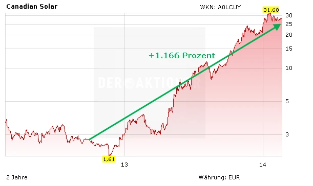 So hat der maydornreport im August 2012 die Aktie von Canadian Solar empfohlen. Damals notierte die Aktie des kanadischen Solarkonzerns bei 2,21 Euro. Heute, nur 18 Monate später, werden 28 Euro für eine Aktie bezahlt – also 1.166 Prozent mehr. Und es spricht vieles dafür, dass sich diese außergewöhnliche Entwicklung sogar noch fortsetzt.