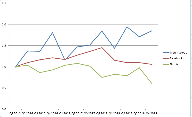 Seit 2016 ist der Umsatz um satte 75 Prozent gewachsen. Der Clou: Dafür musste die Match Group ihre Werbe-Ausgaben pro Quartal quasi nicht anheben. Das heißt, das Business ist zu großen Teilen ein „Selbstläufer“. Zudem wird die Wertschöpfung der bereits aktiven User durch neue Produkte wie Gold vertieft. Dieses kerngesunde Verhältnis von Marketing- zu Umsatzwachstum ist für Aktionäre ein Traum. Ganz anders sieht es hingegen bei Netflix aus. Seit dem Q1 2016 hat sich der Quartalsumsatz zwar verdoppelt – doch dies wurde fast mit einer ver-4-fachung des Marketing-Budgets erkauft. Auch bei Facebook ist die Marketing-Effektivität zuletzt leicht rückläufig. Die Grafik zeigt: normiertes Verhältnis von Umsatz pro eingesetzem Marketing-Dollar. Weitere Informationen zur Match-Group-Aktie ab Mittwoch im neuen AKTIONÄR.