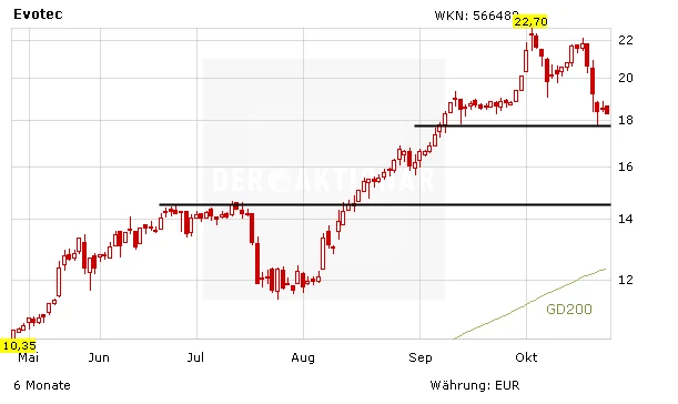 Die Aktie von Evotec ist zuletzt nach einer lang andauernden Rallye in eine Konsolidierung übergegangen. Bei 17,80 Euro ist das Papier zuletzt aber auf eine Unterstützung aufgelaufen. Mit der heutigen Meldung gewinnt Evotec 1,5 Prozent auf 18,55 Euro. Evotec ist einer der besten deutschen Biotech-Titel. Die aktuelle Konsolidierungsphase bietet aus langfristiger Sicht eine gute Kaufgelegenheit. Anleger können auch versuchen, mit Abstauberlimits zum Zuge zu kommen.