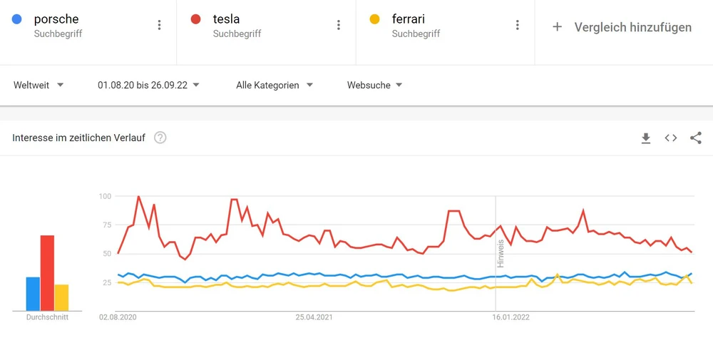 Klar ist: Die Marke Porsche hat nichts an Glanz verloren. Zwar zog der Aufsteiger Tesla im Netz lange Zeit drei Mal so viel Aufmerksamkeit auf sich, doch mittlerweile liegt der Google-Trends-Chart nur noch auf dem doppelten Niveau. Unter Börsianern ist Tesla hingegen weiterhin mit dem Faktor 10 höher bezahlt, was den Börsenwert angeht.