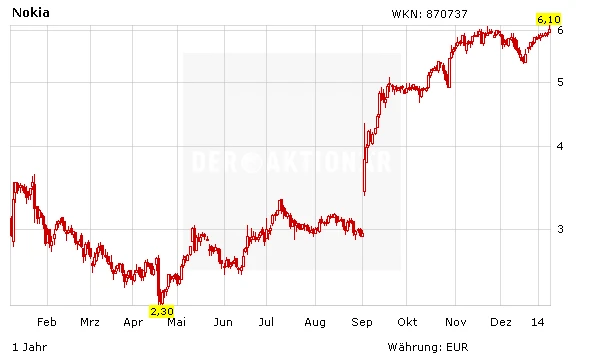 DER AKTIONÄR ist nach wie vor positiv für Nokia gestimmt. Nachdem das alte Jahreshoch überwunden werden konnte, wäre der Weg auch aus charttechnischer Sicht frei. Das Kursziel liegt bei 8,00 Euro, ein Stopp bei 4,80 Euro sichert die Position ab.
