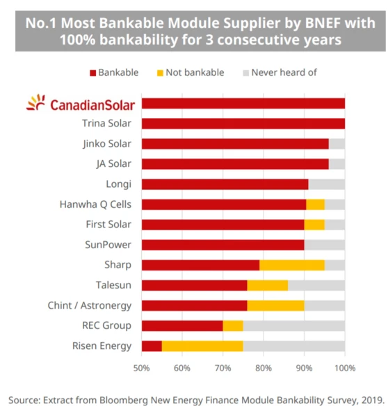 Canadian-Solar-Module sind aufgrund ihrer Langlebigkeit und Leistungsstabilität bei Banken beliebt (siehe Grafik), die große Solarkraftwerke oft finanzieren.