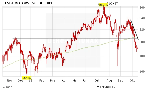 Durch das Software-Update kommt Musk seinem Ziel, in wenigen Jahren ein komplett autonomes Auto auf der Straße zu haben, etwas näher. Sollten die rechtlichen Bedenken aus dem Weg geschafft werden, dürften selbstfahrende Autos stark im Kommen sein – mit Tesla als wichtigem Player. Doch kurzfristig liegt der Fokus auf dem Erreichen der Jahresziele. Um die Prognosen von 50.000 verkauften Fahrzeugen zu erreichen, müsste Tesla im letzten Quartal 17.000 Fahrzeuge absetzen. Aufgrund der Probleme mit den Fahrzeugtüren beim Model X könnte das Ziel jedoch verfehlt werden. Neuanleger halten sich aktuell auch aufgrund des schwachen Chartbildes zurück. Die Aktie bleibt aber auf der Watchlist.