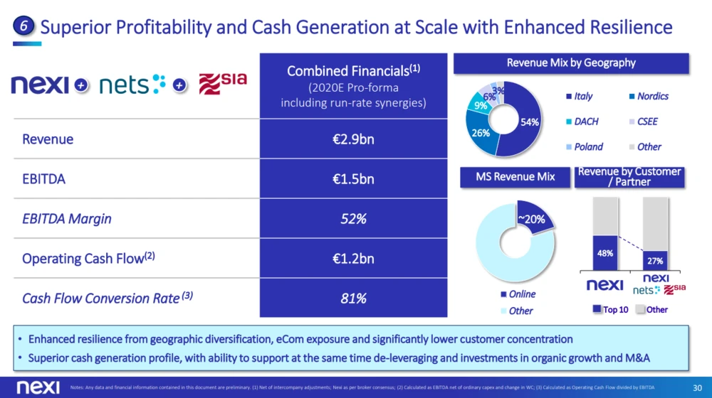 Nach Angaben von Nexi entsteht durch den Zusammenschluss ein europäisches Branchenschwergewicht, das es im laufenden Jahr pro forma auf Umsätze von 2,9 Milliarden Euro und einen operativen Gewinn von 1,5 Milliarden Euro bringen würde. Darin enthalten ist auch Synergiepotenzial in Höhe von rund 170 Millionen Euro jährlich.