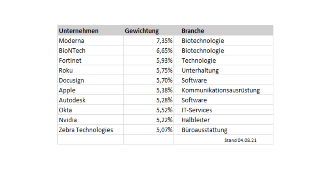 Aus dem Bereich der Biotechnologie erkannte der Indikator bereits bei Auflage des Next 20 Index im Dezember letzten Jahres das Potenzial der beiden Impfstoffaktien Moderna und BioNTech. Beide Unternehmen weisen aktuell die höchste Gewichtung im Index auf.