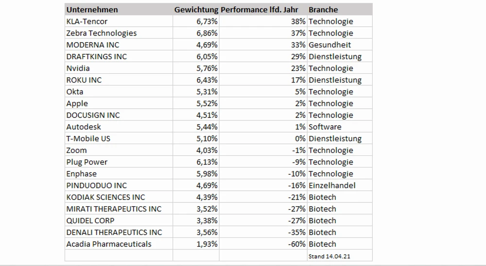 Die Aktien vom amerikanischen Software- und Geräteanbieter zur Datenerfassung Zebra Technologies und dem Arzneimittel-Entwickler Moderna konnten ebenfalls mehr als 30 Prozent Kurssteigerung seit Jahresanfang aufweisen. Auch Zebra Technolgies überzeugte bei den jüngsten Quartalszahlen. Das Unternehmen vermeldete einen Gewinn von 4,46 Dollar je Aktie bei einem Umsatz von 1,31 Milliarden Dollar. Analysten hatten im Schnitt lediglich einen Gewinn von 3,80 Dollar je Aktie bei einem Umsatz von 1,25 Milliarden Dollar erwartet.