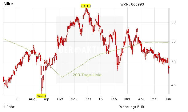 Die Aktie von Nike verläuft sei Monaten in einer volatilen Seitwärtsbewegung und ist gut fünf Prozent von der 200-Tage-Linie, die bei 54 Euro liegt, entfernt. Eine Besserung des charttechnischen Bildes ist erst möglich, wenn die Aktie auf dem jetzigen Niveau ihren Boden findet. DER AKTIONÄR rät von einem Neukauf ab.