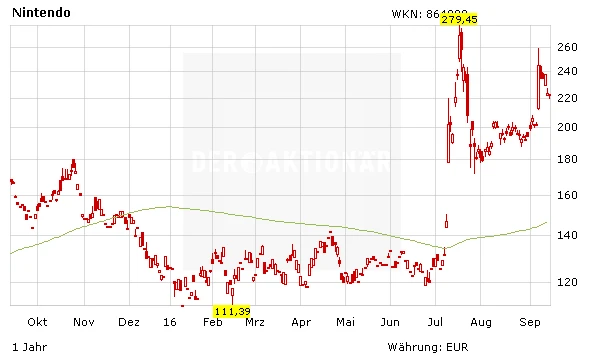 Die Neuigkeiten zur Super-Mario-App haben die Nintendo Aktie in der vorangegangenen Woche ordentlich in die Höhe getrieben. Die Korrektur setzte aber prompt ein, sodass die Aktie bei einem derzeitigen Stand von 224 Euro bislang gut die Hälfte der Gewinne wieder verlor. Bereits investierte Anleger lassen ihre Gewinne mit nachgezogenem Stopp laufen.